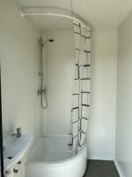 Polyvalent et Complet : Offre une solution tout-en-un avec des cabines pour toilettes, douche, et urinoir, ainsi qu’une chaudière pour l’eau chaude.